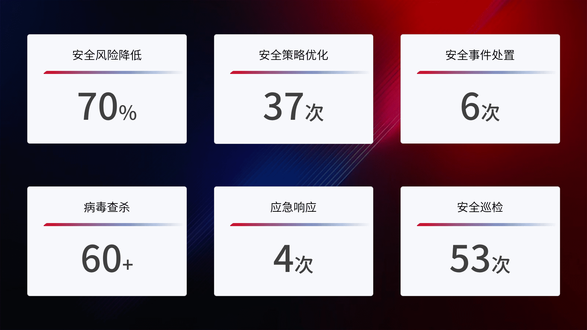 提供全面的安全事件报告体系,,,包括处置报告、、、、周报、、季度和年度总结,,结合持续监控,,,帮助客户深入了解网络安全状况。。。