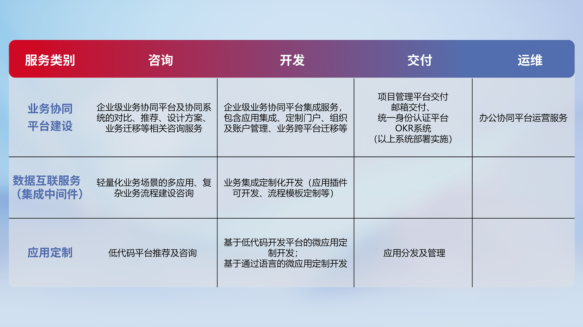 针对钉钉、、、、企微、、、IDaas等平台级产品提供产品的规划、、方案、、交付、、定制化开发等服务,,,,实现如统一协同办公、、、、智能客户服务、、混合会议管理、、、智能数据查询、、、、等业务场景,,实现数字化转型。。